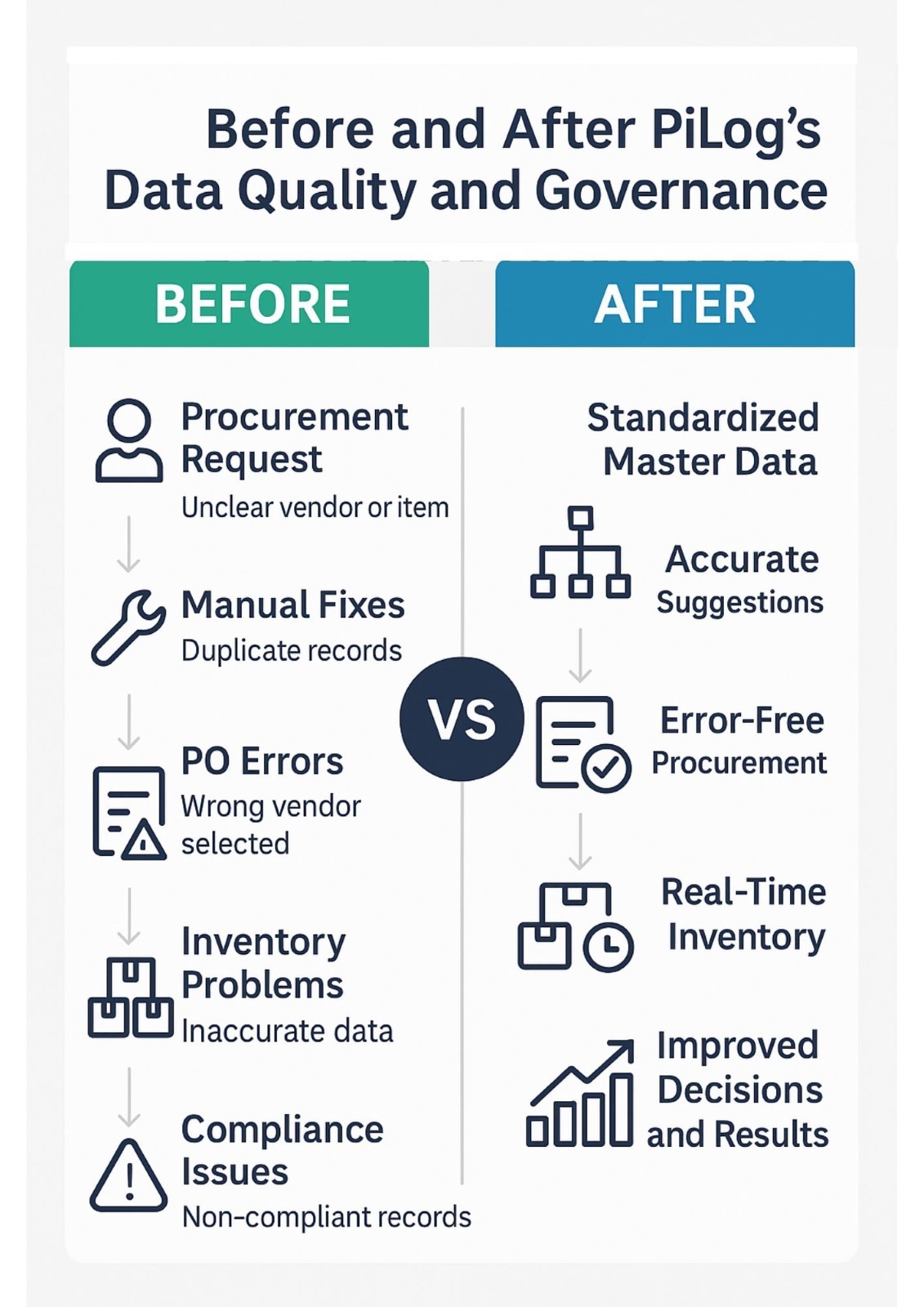 With PiLog Data Quality and Governance Suite, the entire workflow is transformed. Vendors are verified and de-duplicated. Items are classified using global standards. Every transaction, from request to invoice, is powered by accurate, governed, and ISO-compliant data.